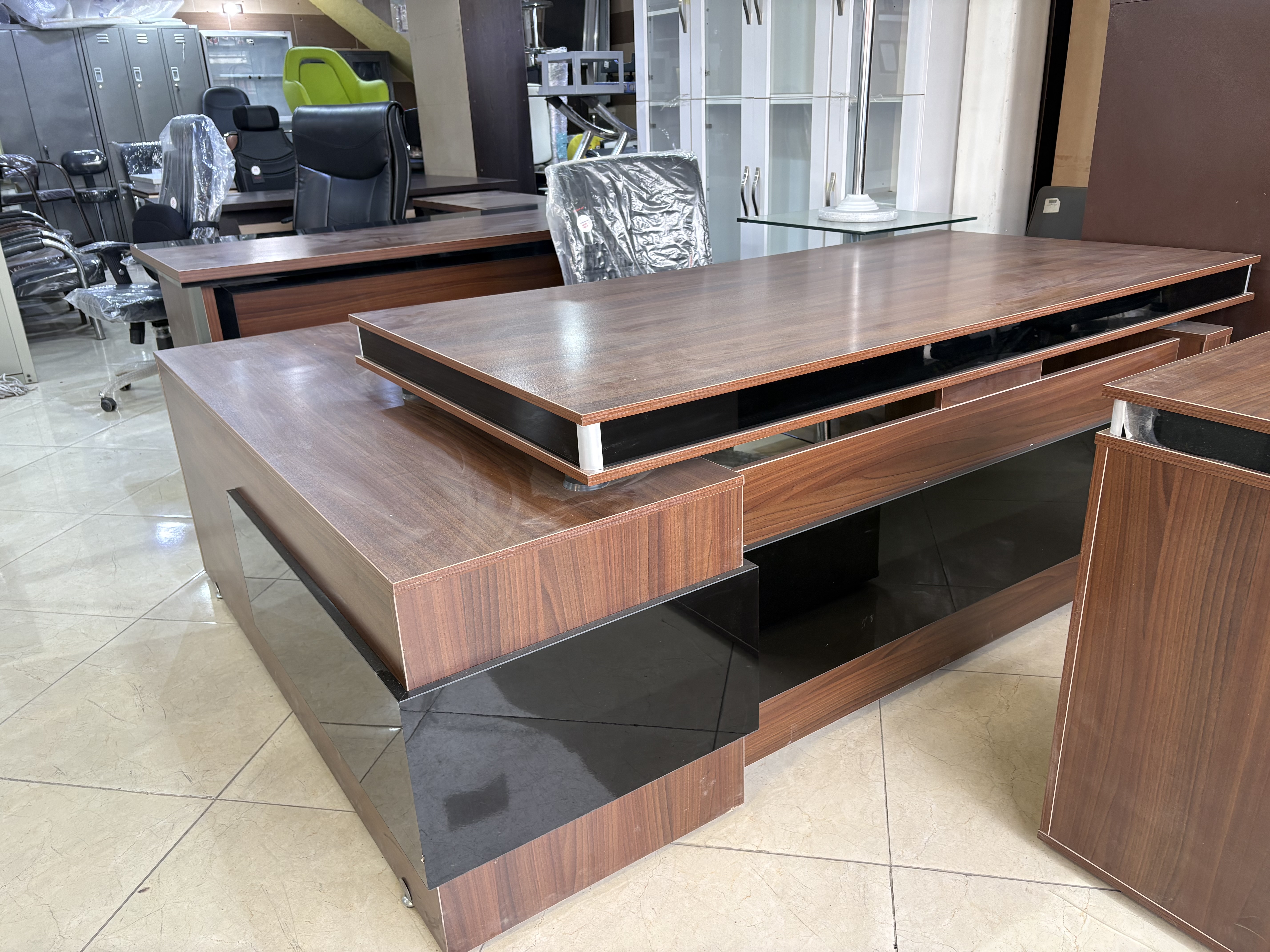 میز مدیریتی تمام ام دی اف (ترک) صفحه رویی و بغل هاش تمام از ام دی اف استفاده شده است، و در بعض جا های میز برای زیبایی کار از ملامین استفاده شده است